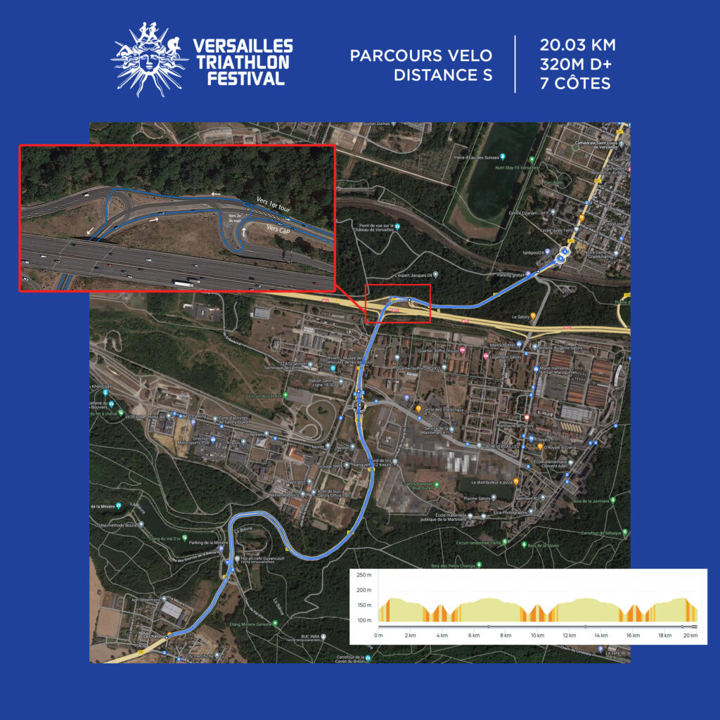 La distance à parcourir en vélo est 20km. D’emblée la montée à Satory par l’avenue Clément Ader fera chauffer vos cuisses.
